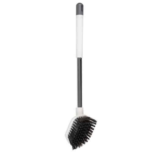 Lapított kefe: A hegyes végű, polipropilén (PP) anyagú kefe kiválóan alkalmas a sarkok és a nehezen hozzáférhető helyek tisztítására, precíz munkát végezve a bonyolultabb WC kagylóformák esetén.