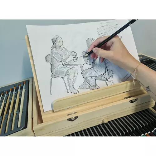 - 83 elem – a bőröndben lévő festőkészlet sok elemet tartalmaz, többek között: bőrönd festőállvánnyal, vázlatfüzet, 10 festőecset, 12 különböző lágyságú ceruza (2xH, 2 HB, 2xB, 2x2B, 2x4B, 2x6B), radír , hegyező, 8 akril festék, paletta, 12 akvarell festék, 28 színes ceruza, 8 olajpasztell.