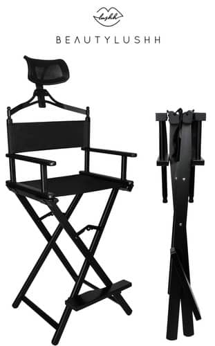 ÖSSZECSUKHATÓ SMINKELŐ SZÉK FEJTÁMLÁVAL – Kivételesen erős és kényelmes székünk sminkeléshez, visage-hoz és jelmezhez, emellett nagyszerűen működik rendezőszéknek is. Fekete alumíniumból készült. Az ülőrész vízálló Oxford 600D anyagból készült. Emellett a széket kényelmes fejtámlával is ellátták, ami tovább növeli a kényelmet hosszú munkamenetek során. A termék terhelhetősége akár 140 kg is! Az alsó részen található lábak stabilak és biztonságot garantálnak a használat során.
