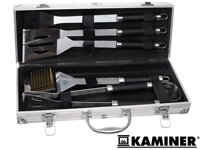 A kiváló minőségű grillezési kiegészítők megkönnyítik és élvezetesebbé teszik a forró grillen való munkát és a grillételek elkészítését. A grilleszközök készlete 5 hasznos elemet tartalmaz: egy villa, egy spatula, egy szilikon ecset és csipesz, valamint egy kefe a grill tisztításához. A készlethez tartozik egy erős tartódoboz. Az ilyen grillező eszközök a konyhában is sikeresen használhatók sütéshez, főzéshez.