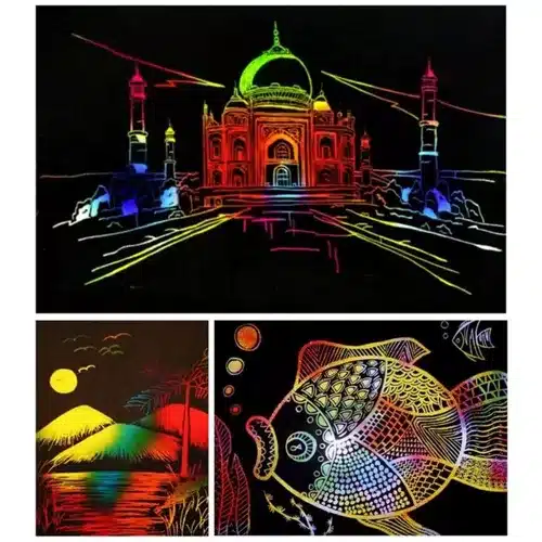 - Képzelet szárnyalás – a karcolókártya készlet rendkívül kreatív játék, szinte korlátok nélkül – bármilyen rajzot „alkothatsz”. Nem csak egy vonzó időtöltés, hanem befolyásolja a gyermek intellektuális fejlődését és a kéz-szem koordinációját. A rajzok készítése fejleszti a kreativitást és serkenti a térbeli képzelőerőt. A kisgyermek koncentrációját és kézügyességét is fejleszti.