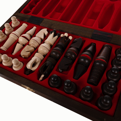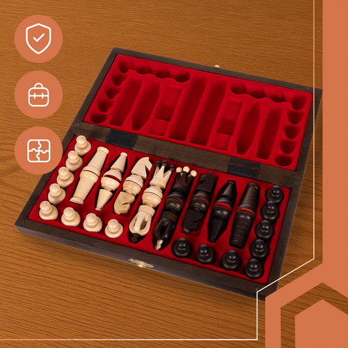 A natúr gyertyánfából készült figurák részletgazdag faragása, a fémszínű díszítőelemek és a selyemfényű lakkozás mind az eleganciát és a kiváló kidolgozást hangsúlyozzák. A sakk tábla praktikus módon összecsukható bőröndként funkcionál, belül puha béleléssel, hogy a figurák mindig biztonságban legyenek.
