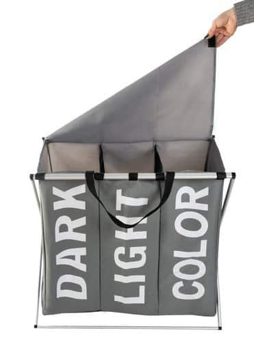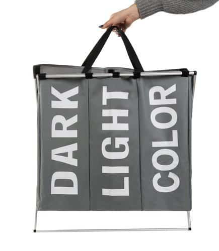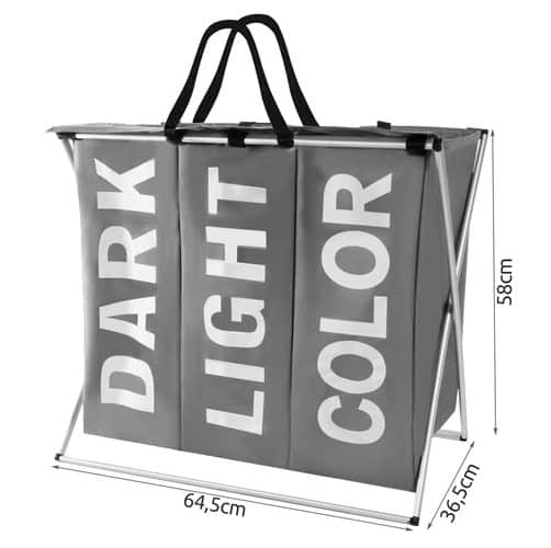 Ez a három rekeszes szennyestartó fantasztikus megoldás azoknak, akik szeretik a praktikus megoldásokat! A kosár belsejében 3 rekesz található. Minden rekesz megvan nevezve (sötét, világos és színes), ami megkönnyíti a szennyes ruha szétválogatását. A kosár hordozható, ezért rendelkezik speciális fogantyúkkal. A belső anyag vízálló, így nem kell attól aggódnod, hogy a fürdőszobában lévő vízcseppek miatt, bevizesednek a kosárban lévő ruhák. Ezenkívül nem szívja fel a nedvességet és a különféle kellemetlen szagokat. A tágas és modernszennyeskosár helyet biztosít a koszos ruhák és fehérneműk tárolására. Erős szövetből készült, amely 3 nagy rekesszel rendelkezik (a sötét, világos és színes ruhák elkülönítésére). A kosár nagyon könnyen tisztán tartható, csak egy nedves ruhával át kell törölnie. A kosár masszív kerete biztosítja a stabilitást. A fedélnek köszönhetően nem jön ki kellemetlen szag a szennyeskosárból. A huzat ezenkívül tépőzárral rögzíthető.