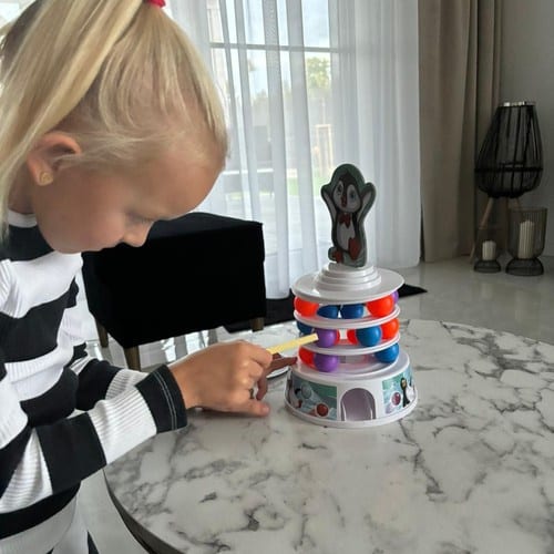 3. Golyók Eltávolítása – Óvatosan húzd ki a golyókat pálcikával, próbálva megőrizni az egyensúlyt, és a pingvint a torony tetején tartani.