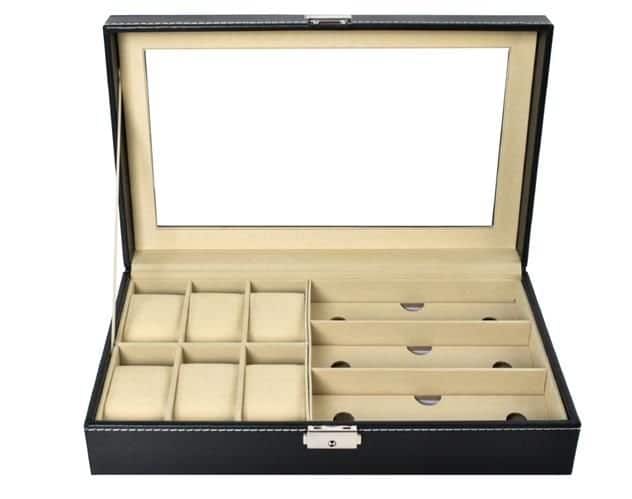 Az elegáns ékszertartó sok rekeszes, a tok elegáns fekete színű és fehér varratokkal rendelkezik, ami eleganciát és stílust ad az egésznek. A doboz fedele átlátszó, így a doboz nemcsak tárolásra használható, hanem a tartalom elegáns bemutatására is. A doboz sikeres és hasznos ajándék lesz, amelyet minden bizonnyal nagyra fognak értékelni. Bármilyen belső térbe illik, nőknek és férfiaknak egyaránt megfelelő, így mindenképpen jó ajándék. A doboz belseje puha anyaggal van párnázva, így a tárolt holmik védettek a karcolásoktól. A rekeszeket magasabb falak választják el, amelyek megvédik a tárolt dolgokat a nem kívánt érintkezéstől, ami károsodáshoz, karcoláshoz vezethet. Különösen esztétikus és biztonságos pattintós zárás véd a doboz tartalmának véletlenszerű kiömlésétől.